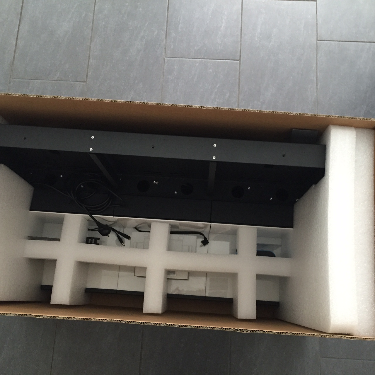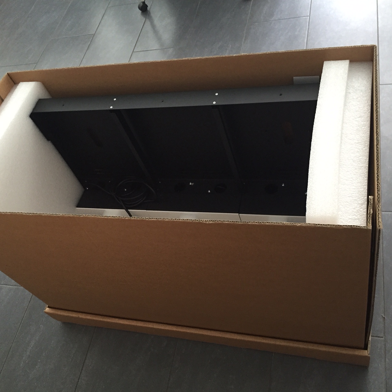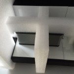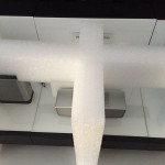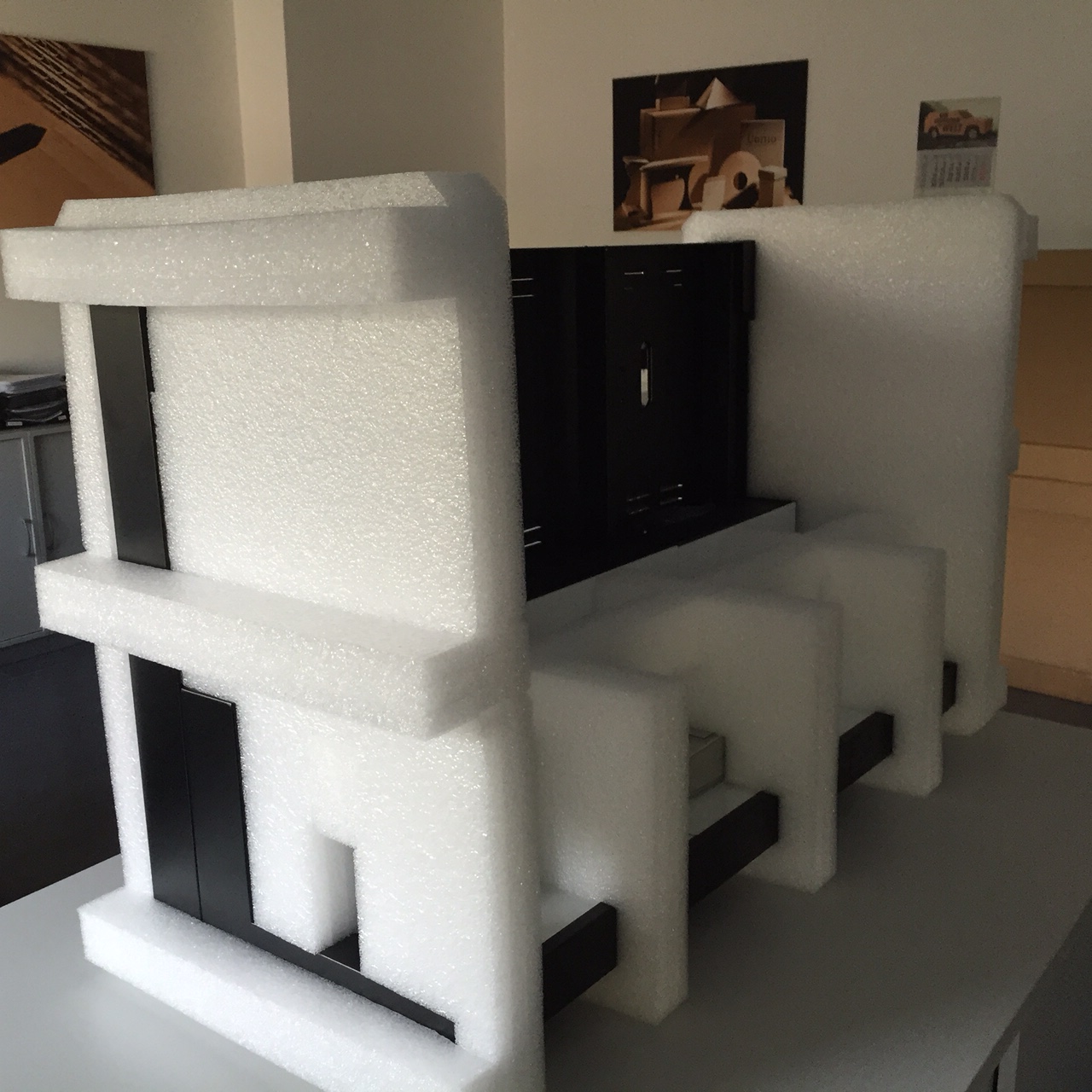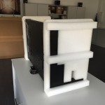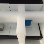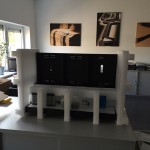 Wir haben uns für einen vierteiligen Außenkarton entschieden: Boden und Deckel sowie zwei gerillte Seitenwände mit Grifflochstanzungen. Das Inlet aus Schaumstoff lässt das Display im Karton “schweben” und schützt es so vor Stößen. Alle losen Teile bleiben an ihrem Platz und müssten weder umständlich nach dem Transport im Karton gesucht werden, noch können sie das Display beschädigen. Außerdem ist es für die zweite Displaygröße geeignet, so dass nur der Außenkarton angepasst werden musste.