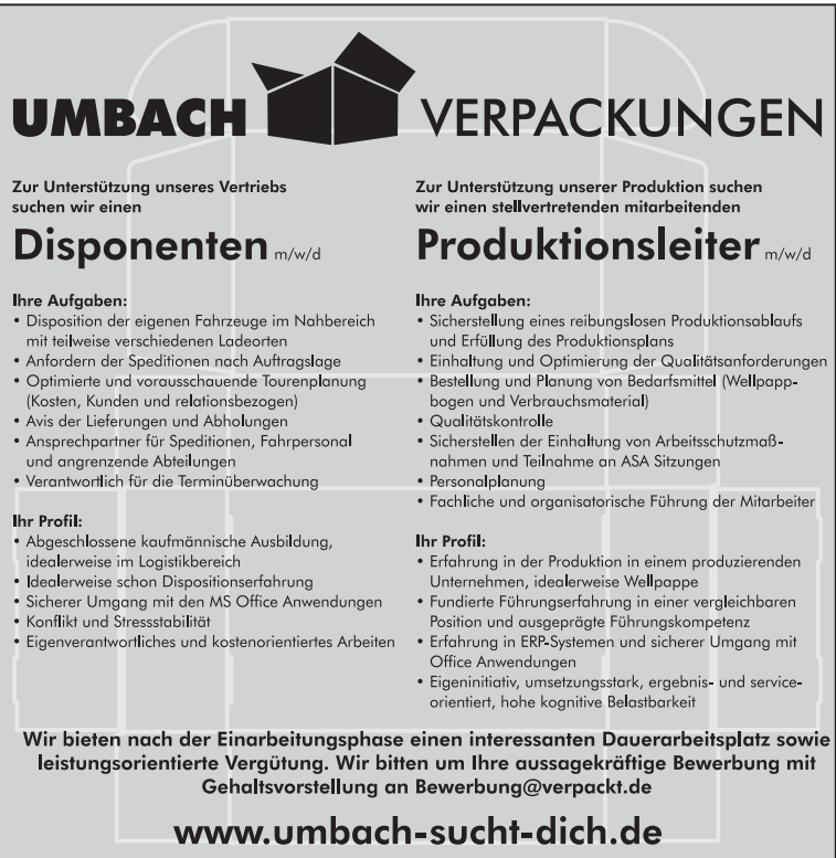 Weitere interessante Jobangebote für unser Unternehmen Umbach Logistik finden Sie unter www.umbach-sucht-dich.de. Wir freuen uns auf Ihre aussagekräftige Bewerbung.