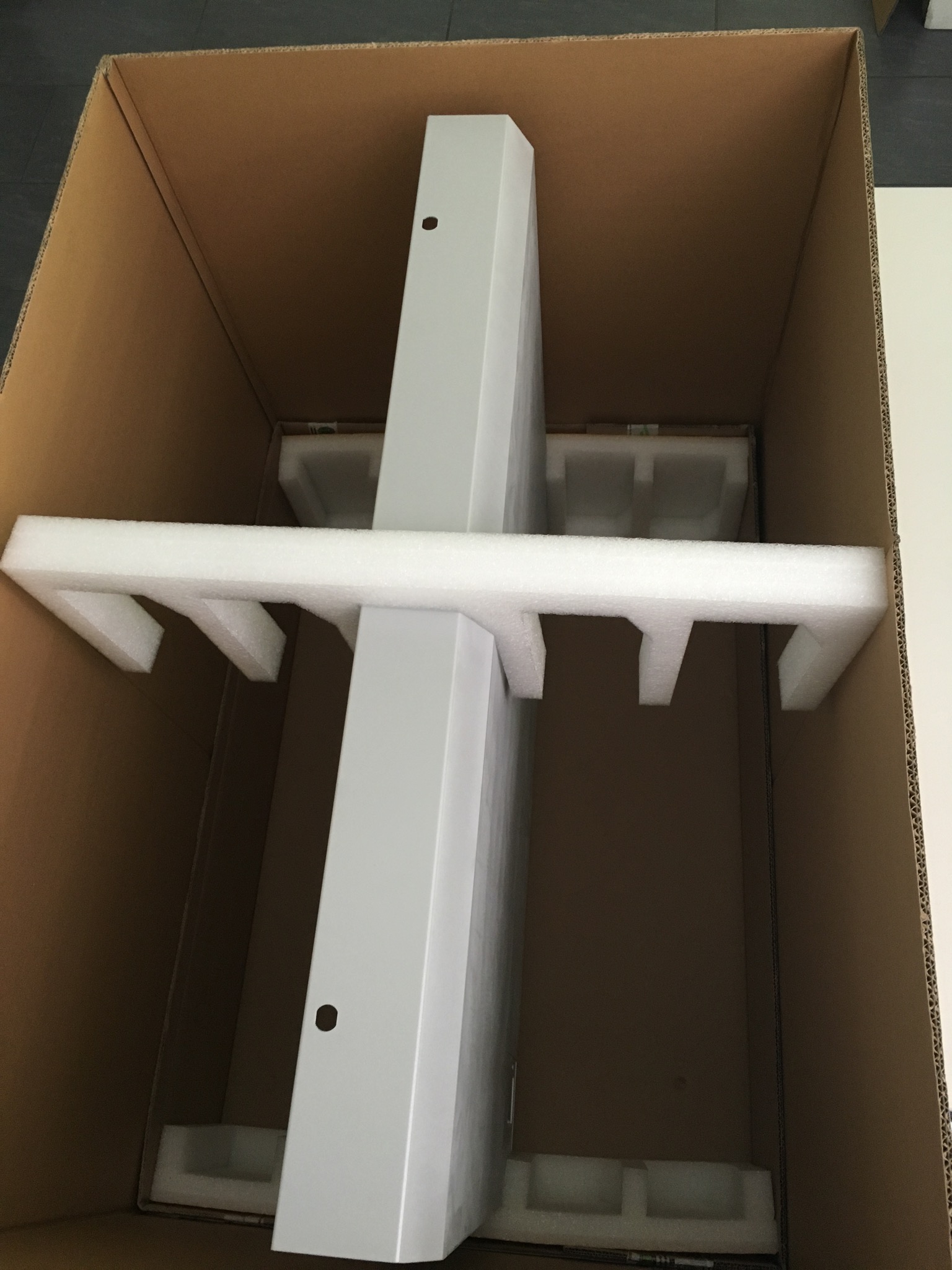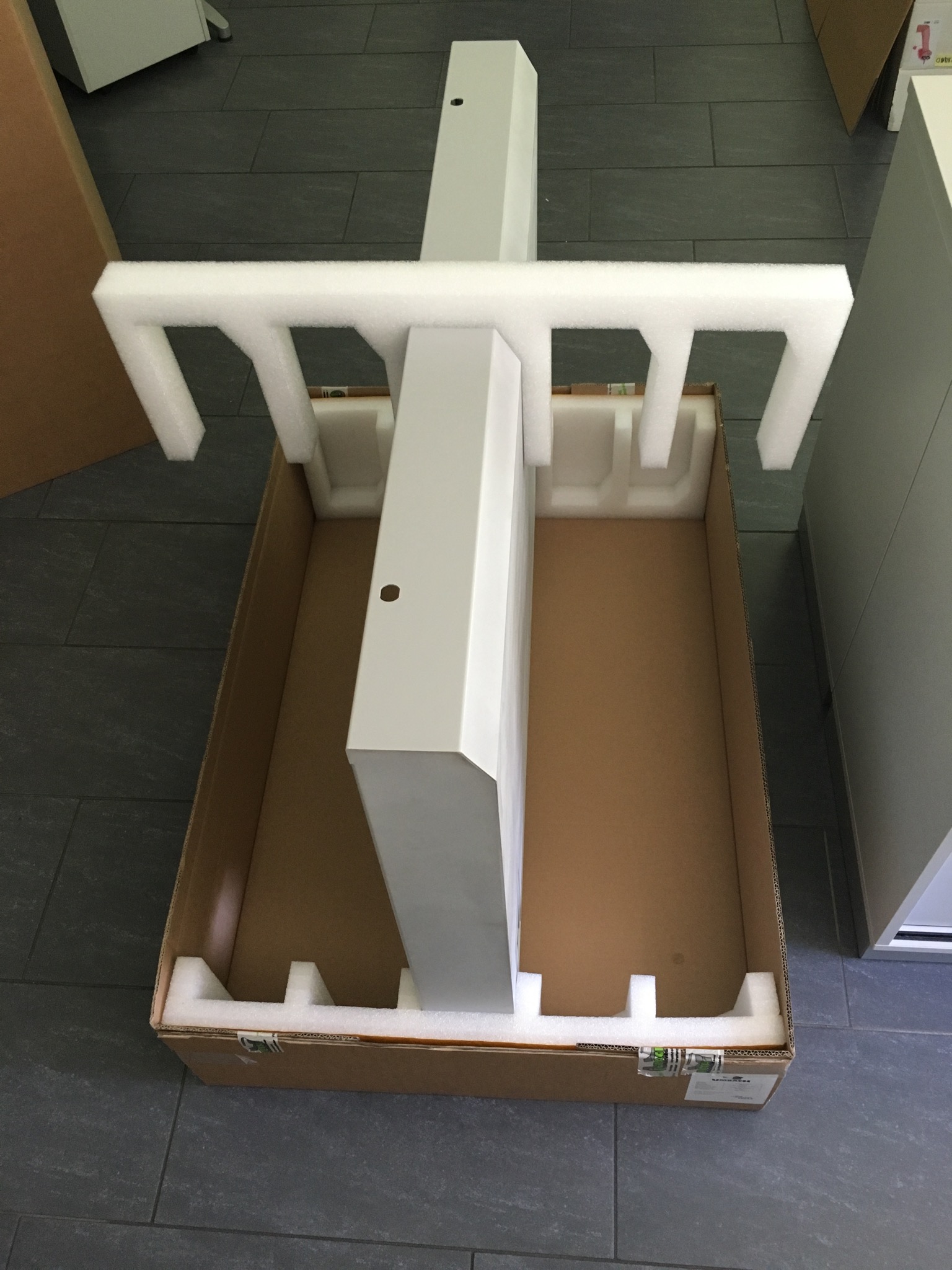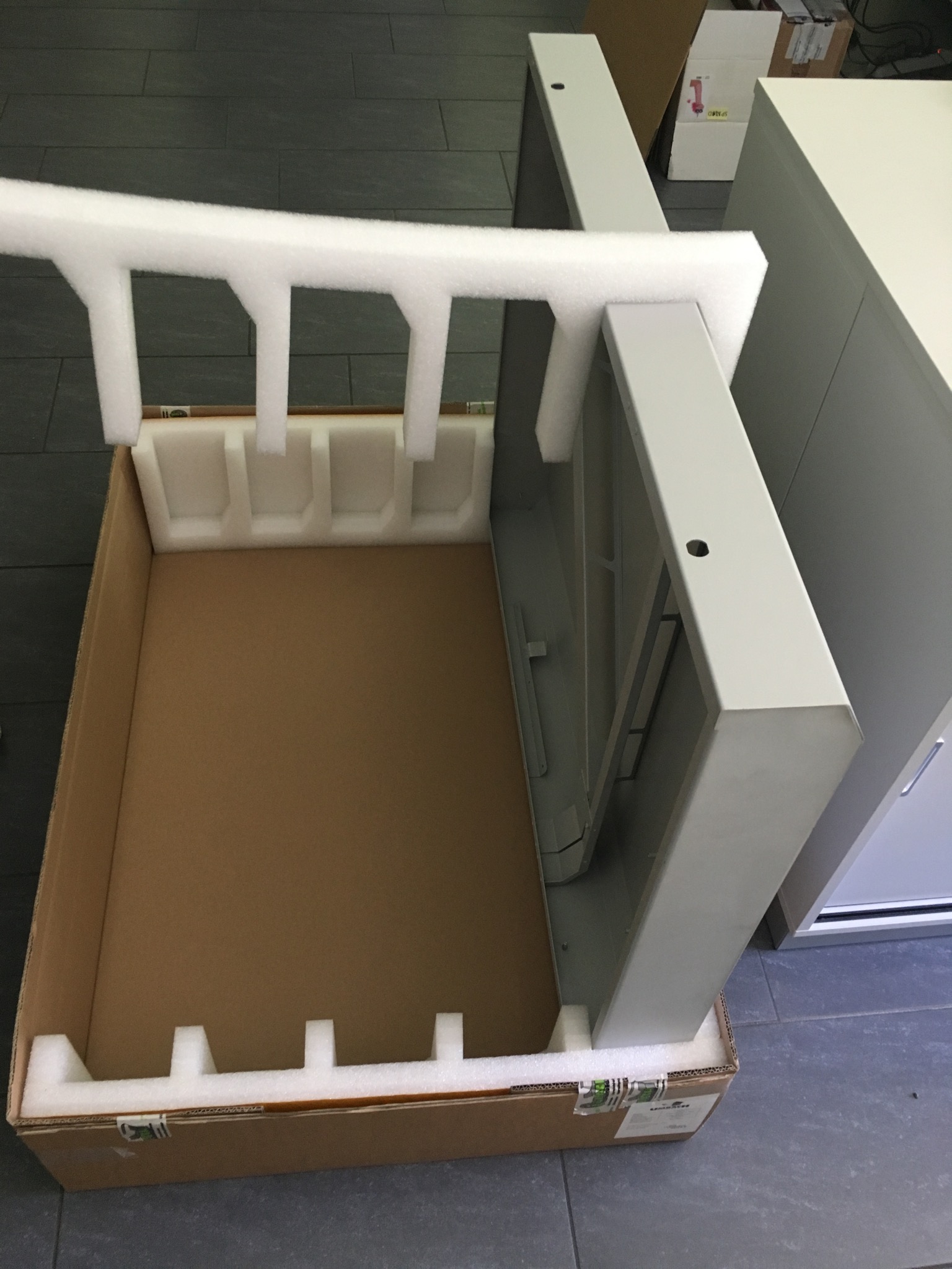 Erneut durften wir für einen Kunden über eine knifflige Aufgabenstellung nachdenken, die eine maßgeschneiderte Lösung von uns erforderte: Herausforderung war, eine Mehrwegverpackung aus Wellpappe zu konstruieren. In der Kartonage werden zukünftig Geräteschranktüren verpackt, die zur weiteren Bearbeitung versendet werden müssen. Das Packmass der unaufgebauten Verpackung sollte dabei so gering wie möglich sein, damit die Kartonage zurückgesendet und wiederverwendet werden kann. Hier sehen Sie unsere Lösung. Diese mehrteilige Verpackung lässt sich auf ein Minimum zusammenlegen.