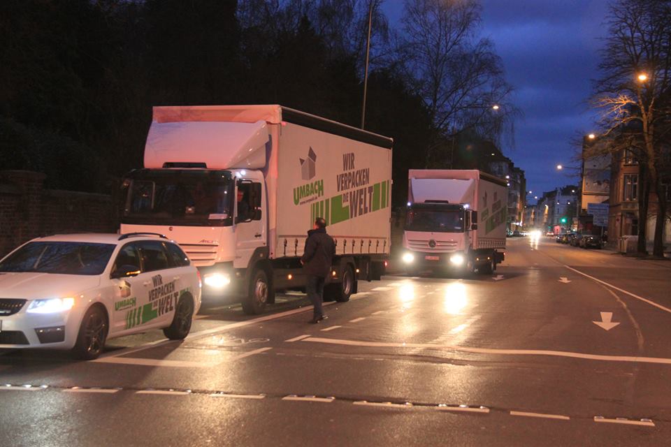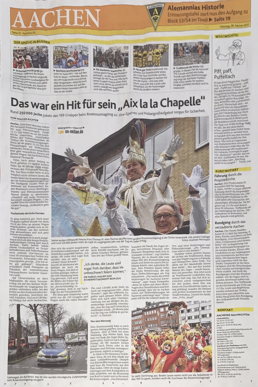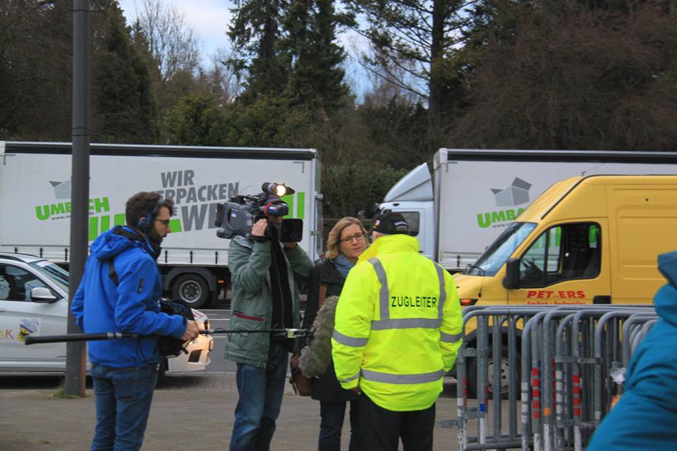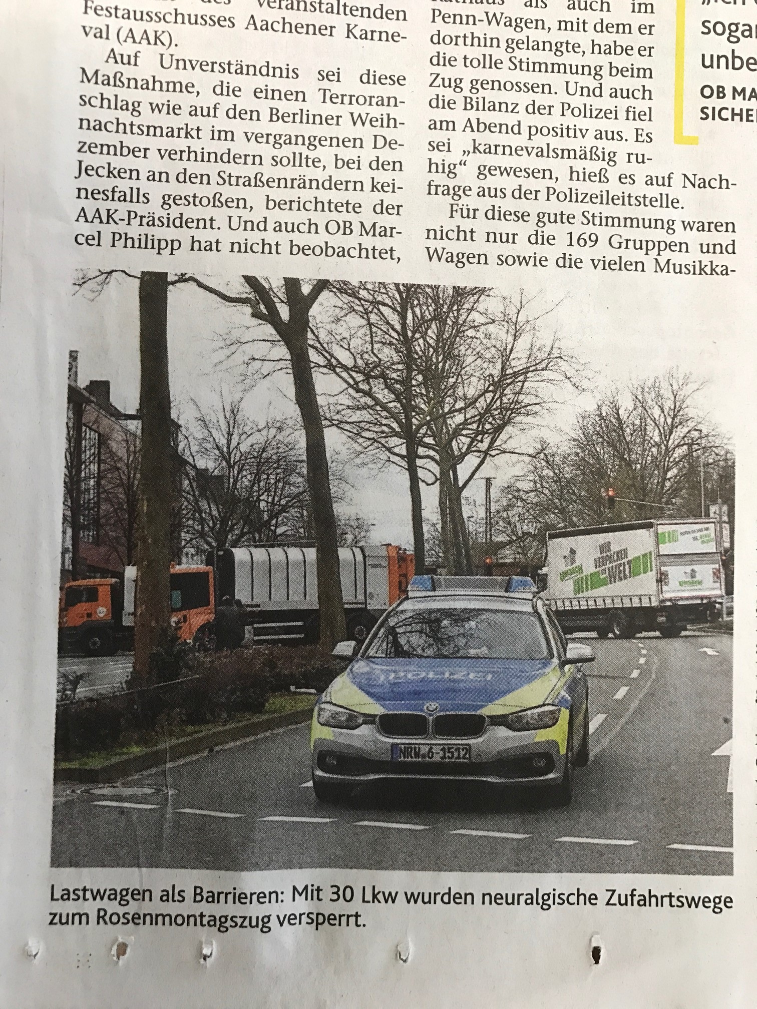 Eine Woche vor Karneval lasen wir in der Zeitung, dass viele Karnevalsvereine mit den auferlegten neuen Sicherheitskonzepten überfordert seien. Zur Absperrung von Zugangswegen sollten LKW-Sperrungen für die Sicherheit sorgen. LKW’s zu leihen, sei aber teuer und für die Veranstalter kaum zu finanzieren. Wir haben nicht lange überlegt und recherchiert, wer in Aachen für die Organisation des Kinderkarnevalzuges am Tulpensonntag und des großen Karnevalzuges am Rosenmontag zuständig ist. Dabei sind wir auf den FestAusschuss Aachener Karneval e.V., Aachens Dachorganisation der Karnevalsvereine, gestoßen. Ein paar Telefonate später stand fest, dass wir unsere Wagen kostenlos zur Verfügung stellen, um bei der Umsetzung des Sicherheitskonzeptes zu unterstützen. Zum Dank gab es ein großes ALAAF und Kamelle. :-)